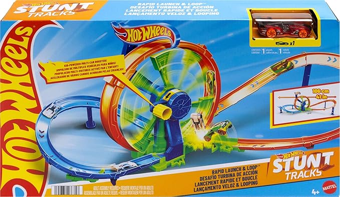 • The Hot Wheels Rapid Launch & Loop Playset features a cranked wheel that boosts cars through a loop, curves and a crash zone repeatedly!