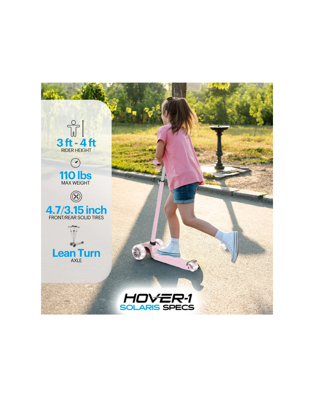 Unleash the magic of motion with the Hover-1 Solaris – where every ride turns into a brilliant light show! Designed to captivate young adventurers, the Solaris features motion-activated multicolor wheel lights that dazzle as they glide, transforming ordinary outings into extraordinary experiences. Built for stability and comfort, the Solaris boasts larger front wheels and a lightweight frame that make every ride smooth and secure. The adjustable handlebar height and 110 pound weight capacity ensures Solaris grows alongside your kids, providing years of outdoor fun. Solaris is equipped with a dependable rear foot brake for quick and easy stops, and the sturdy solid wheels ensure smooth gliding over various surfaces. Let your child shine bright with the Hover-1 Solaris – the scooter that brings excitement, joy, and a splash of color to every journey.