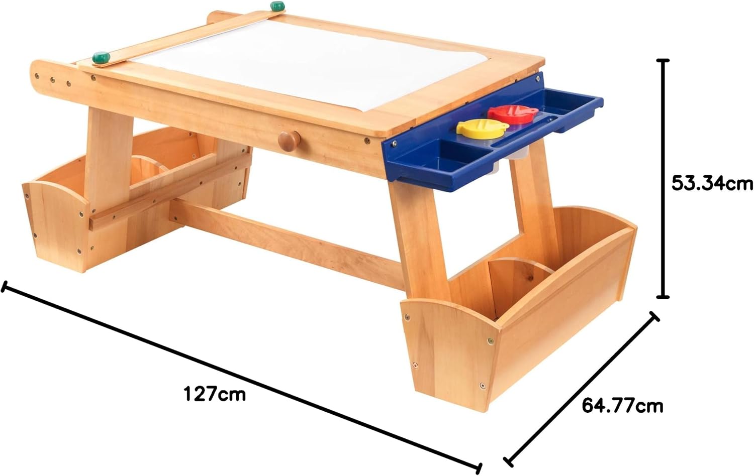 The KidKraft Art Table with Drying Rack & Storage will be the creative center of any playroom. Made of wood with a natural-colored finish, it houses everything a budding artist will need to unleash their creativity. A roll of art paper mounts under the table, feeds through a slot and fastens to the tabletop for a secure work surface. Or, use the flat area for testing out new slime recipes. It’s just their size and keeps the mess off your kitchen table. Kids can stand at the table to do artwork or they can pull up a chair or stool for more intensive projects. Sealable spill-proof cups keep paint fresh and where it belongs, and built-in storage bins on both sides holds supplies so little artists can keep their workspace clean. Now, that’s what we call a masterpiece.