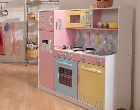 Kids can prepare meals for themselves and their dolls with the KidKraft Cook with Barbie™ play kitchen. This wooden role play kitchen features a modern design paired with iconic Barbie pink hues and touches of gold accents. With a traditional sink, faucet, burners, and refrigerator, this kitchen for kids is ready to whip up imaginative meals.