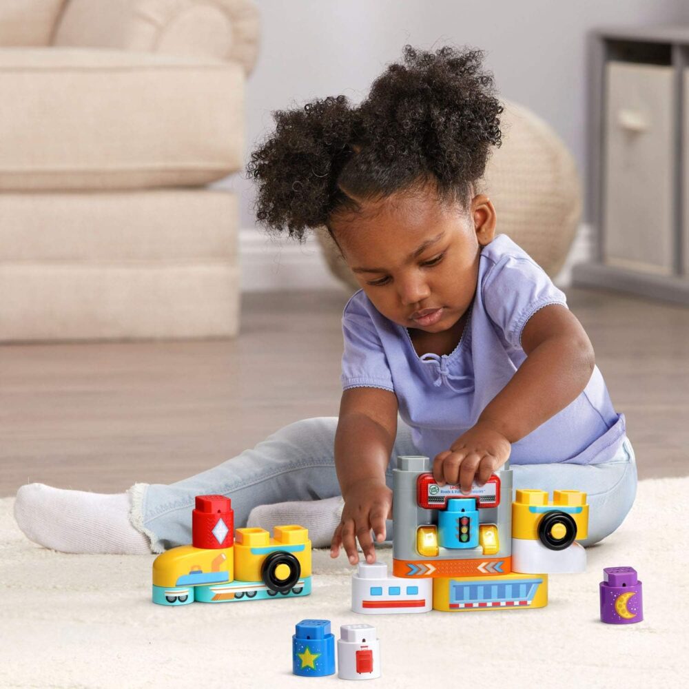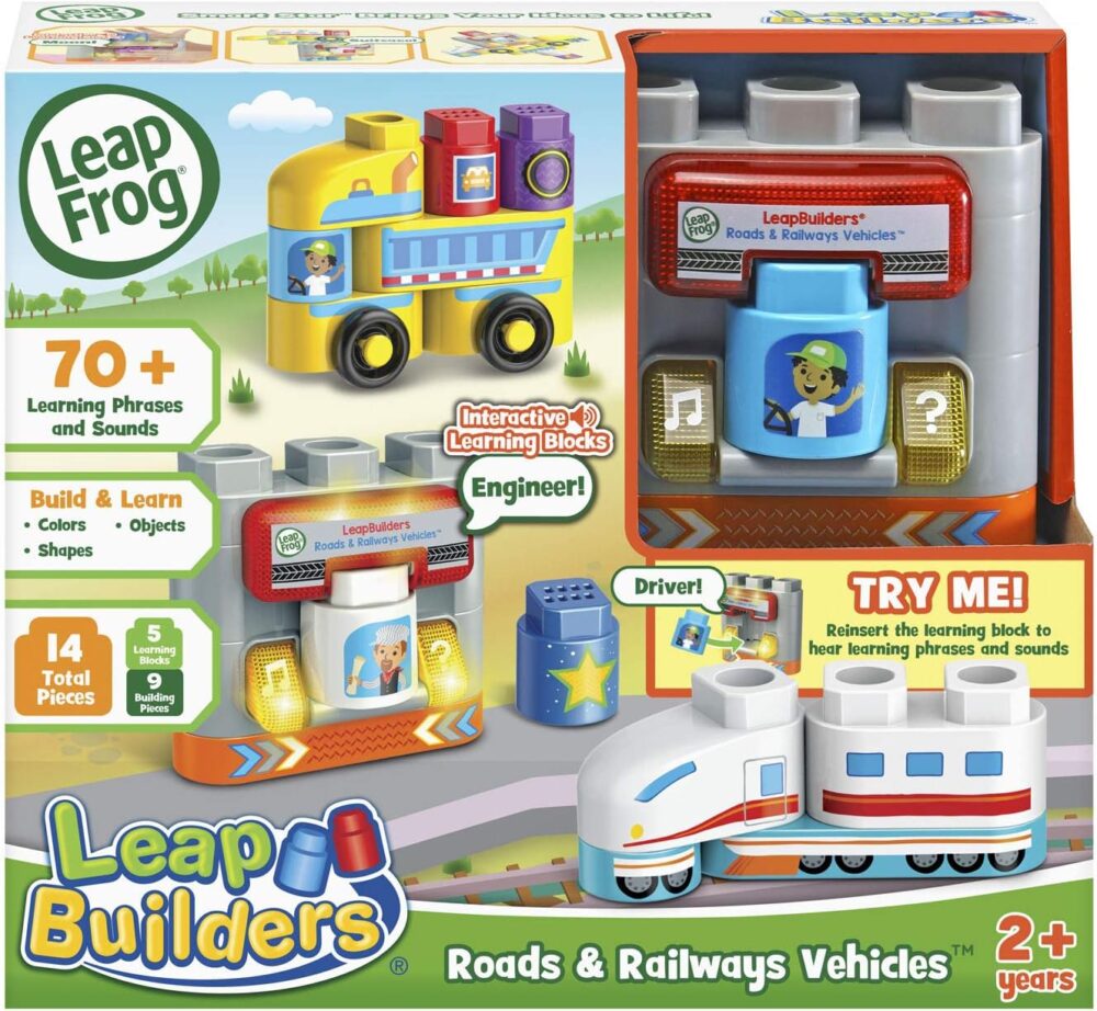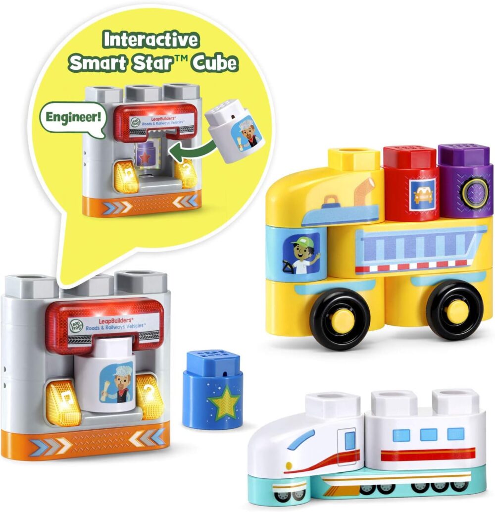 Get moving with the LeapBuilders Roads and Railways Vehicles. Build, create and learn with this interactive 14-piece vehicle-themed block set. Kids can build using the easy-to-hold building pieces and double-sided learning blocks that feature colors, objects and shapes. Insert the five double-sided learning blocks into the interactive Smart Star and it will respond with educational songs and encouraging phrases about colors and shapes that enhance building play with learning content.