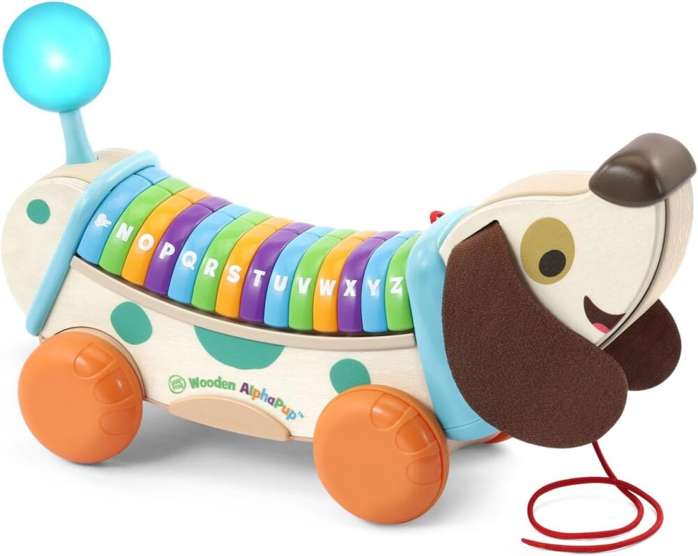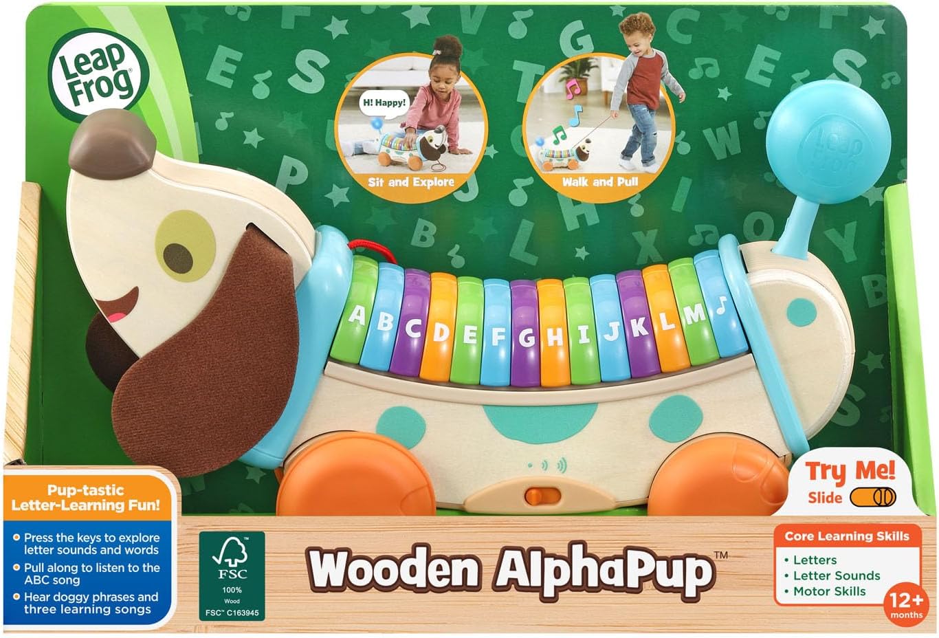 Get in on letter-learning fun with the Wooden AlphaPup Take this cute doggy for a stroll and watch it wobble and light up with engaging phrases and music. Moving helps learning, and this cute pup brings the two together with music and playful sounds that reward little walkers. Sit and explore the letter buttons and soft fabric doggy ears. Push or pull the puppy along to hear the alphabet song and more. The alphabet buttons teach letters and letter sounds and play songs and doggy phrases. This adorable puppy makes a perfect little pal for your developing toddler! This product is made with 100% FSC-certified wood that comes from well-managed forests. Requires 2 AA batteries. Batteries included for demo purposes only. New batteries recommended for regular use.
