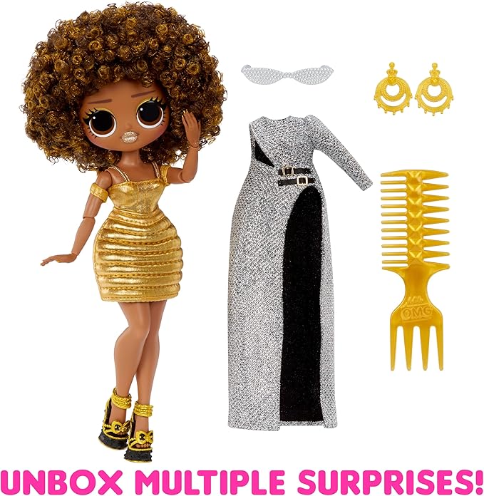O.M.G! We sisters slay all day. We strut unique style like the divas we R & we march to the beat of our own D.J., making everything a ‘lil more outrageous. We stand out from the crowd & write our own set of rules, cuz we’re here to surprise the world. The original fan-favorite L.O.L. Surprise O.M.G. fashion dolls are back in all-new glamorous fashions and beautiful hairstyles: say hello to Royal Bee, the big sister to adorable character, Queen Bee! Royal Bee is the tastemaker of her crew; she is here to bring you all things fashionable and fabulous! Unbox multiple surprises including transforming fashions and fabulous accessories from diamond sunglasses to trendy hoop earrings to showcase her royally glam style! Dress Royal Bee in her dazzling silver dress with two charming black belts! Discover the additional surprise with Royal Bee’s fashions by removing her silver dress to reveal her shining gold bodysuit and skirt, instantly transforming her outfit to a whole different look! This re-release of Royal Bee showcases her stunning features, styled hair, her own elegant outfit, and comes articulated for tons of posing opportunities. Each box includes a L.O.L. Surprise O.M.G. fashion doll, bold outfits, detailed accessories, shoes, and a hair comb! Collect all 4 re-released L.O.L. Surprise O.M.G. dolls: Swag, Neonlicious, Lady Diva, and Royal Bee! Pro tip: hands are removable for easy dressing. L.O.L. Surprise fashion dolls with stylish hair, outfits and many detailed accessory pieces make a perfect toy for kids, including 4 years old and up for imaginative pretend play! As gifts for any special occasion, dolls provide hours of social play with siblings and friends.