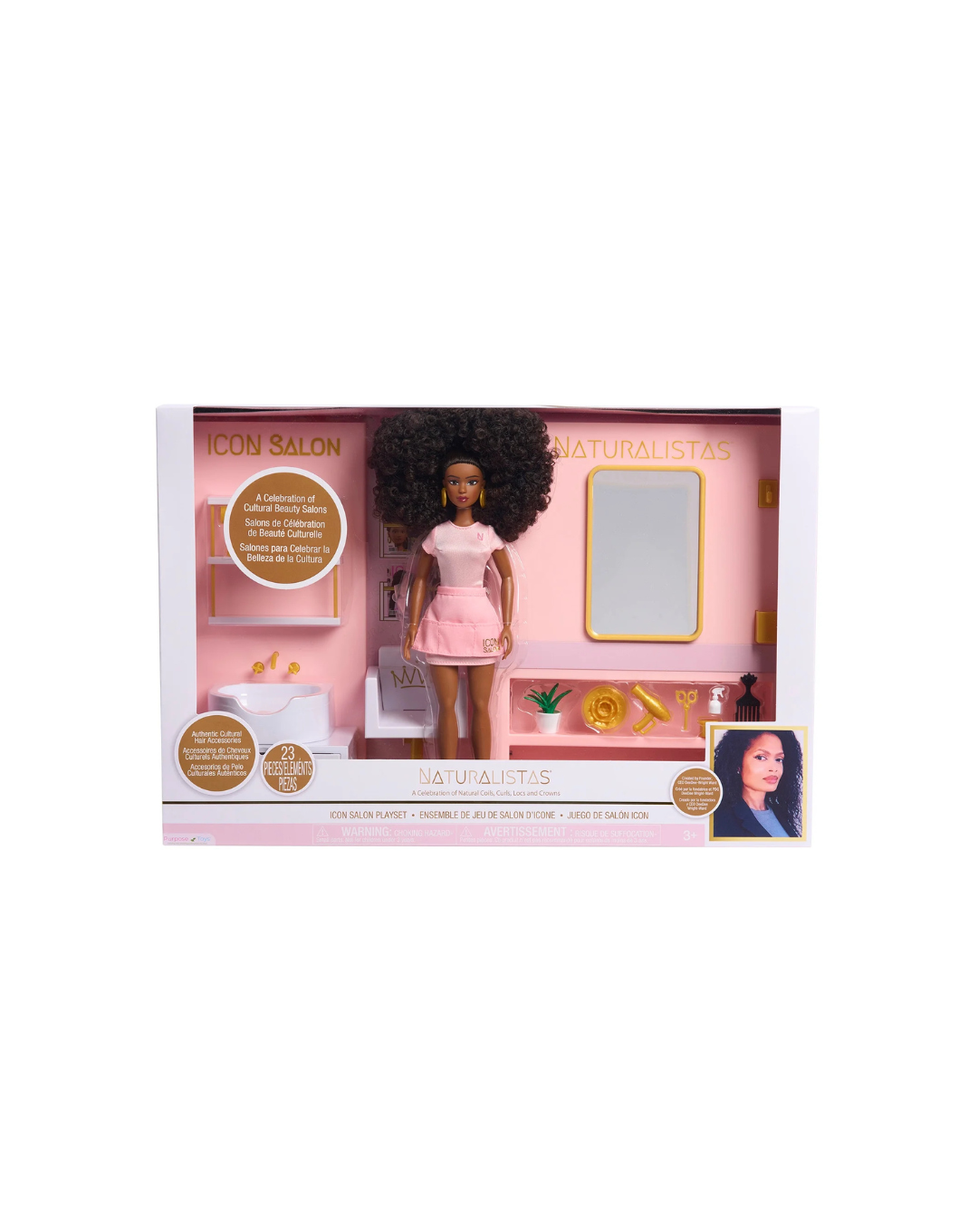 Introducing the Naturalistas ICON Salon Playset, a historic new addition to the Naturalistas line, inspired by and celebrating the iconic culture of beauty salons! Located at the heart of ICON Village, ICON Salon is where all the Naturalistas come together. The ICON Salon Playset reflects the elevated style of the brand and offers complete imaginary play with the inclusion of an exclusive Dayna doll. Dayna is an LA native and owner of ICON Salon. With a degree in business and training from a top beauty school, she is a leading Natural Hair stylist. A businesswoman and celebrity favorite, Dayna’s much-admired career has earned her the nickname, “The Coil Whisperer.” Dayna features 5-points of articulation for lots of creative poses, long voluminous curly 3C textured hair and medium brown skin tone. She wears a pink mini dress with matching apron, gold hoops and strappy heels.