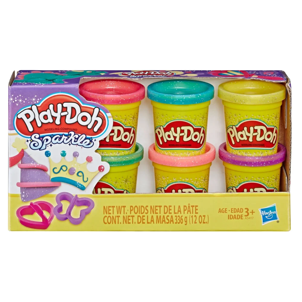 Let imagination shine like the stars with the Play-Doh Sparkle pack! This 6-pack features Play-Doh modeling compound with lots of glitter mixed in. With 6 colors each in 2-ounce cans, kids can imagine all kinds of dazzling creations. Pretend these Play-Doh cans are sprinkled with fairy dust and use the sparkly Play-Doh colors to craft shimmering scenes with the butterfly and heart cutters. Combine this collection with other Play-Doh playsets or toolsets (sold separately) and let it sparkle!