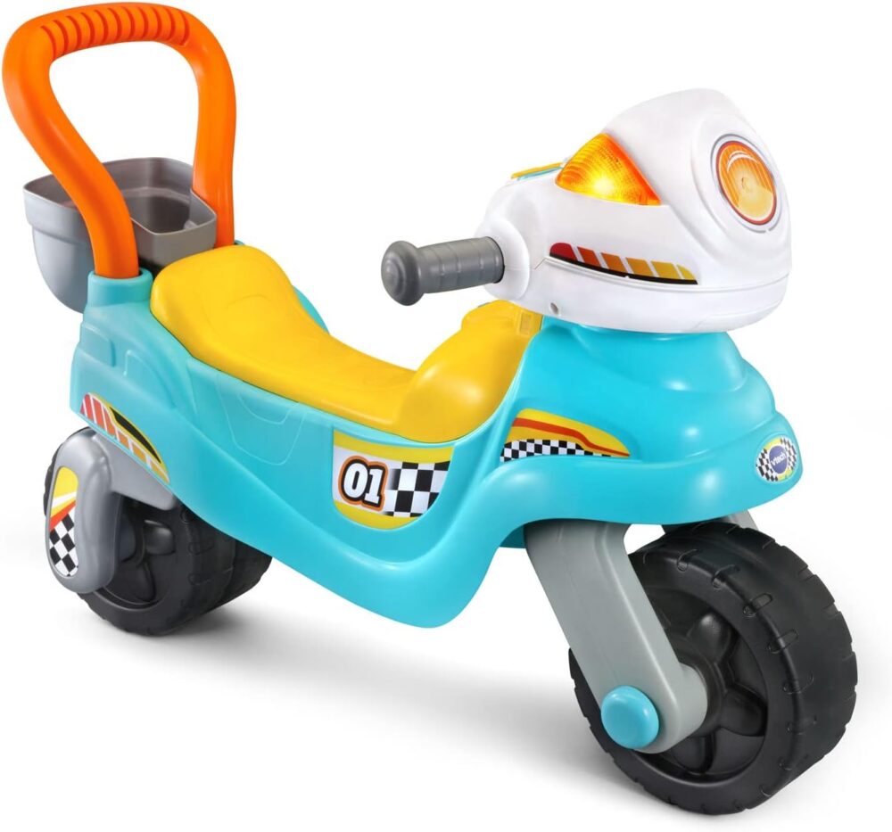 Get revved up and zoom around on the interactive 3-in-1 Step and Roll Motorbike! With a light-up dashboard and ignition key, this combination ride-on vehicle and push walker captures the imagination of little riders and walkers. Little one learning to walk? Use the motorbike with the handle as a push walker to cruise around and strengthen walking skills. Ready to ride? Start them off with the three-wheeler to keep them steady, then try the two-wheeler to practice balancing. Keep the learning journey going with songs and activities that teach about the community, colors and daily life. Active toddlers can enjoy three ways to use this motorbike and 80+ songs, sounds, melodies and phrases. Kick-start their motor skills with the 3-in-1 Step Up and Roll Motorbike
