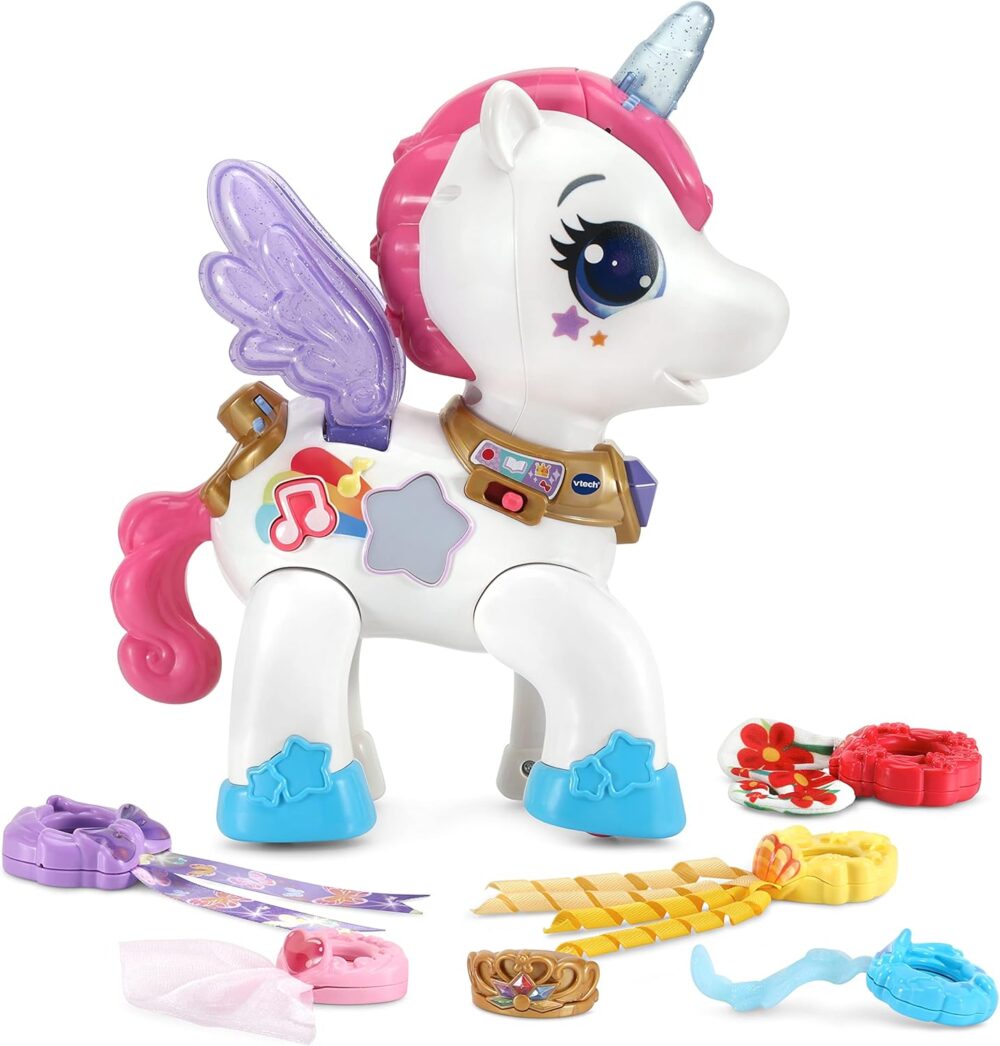Add music to the colorful dress-up party by pressing the music button. The unicorn will play five- or ten-minute songs and her horn and star will flash to the beat. Flap her wings to help her fly and together you’ll sparkle wherever you go!